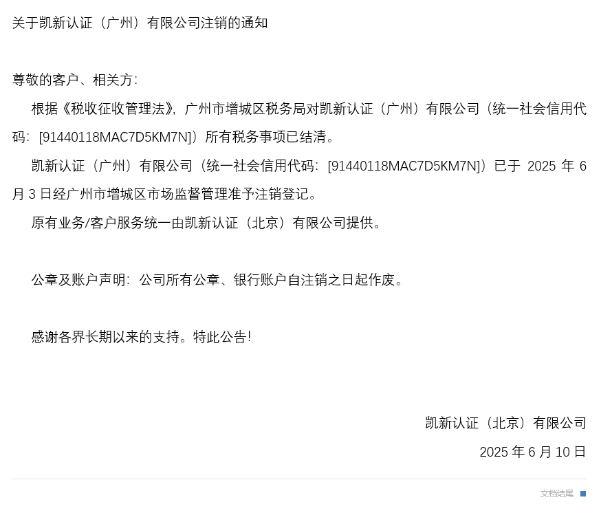 工作通知關(guān)于子公司凱新認(rèn)證(廣州)有限公司注銷的通知
