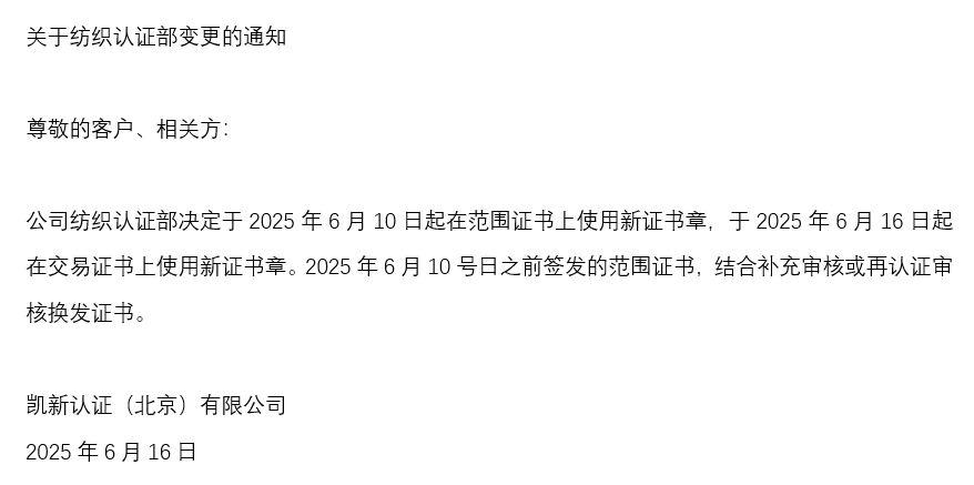 工作通知關(guān)于紡織認(rèn)證部認(rèn)證證書變更的通知